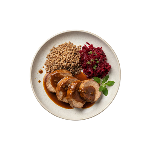 w sosie własnym z kaszą gryczaną i zasmażanymi buraczkami